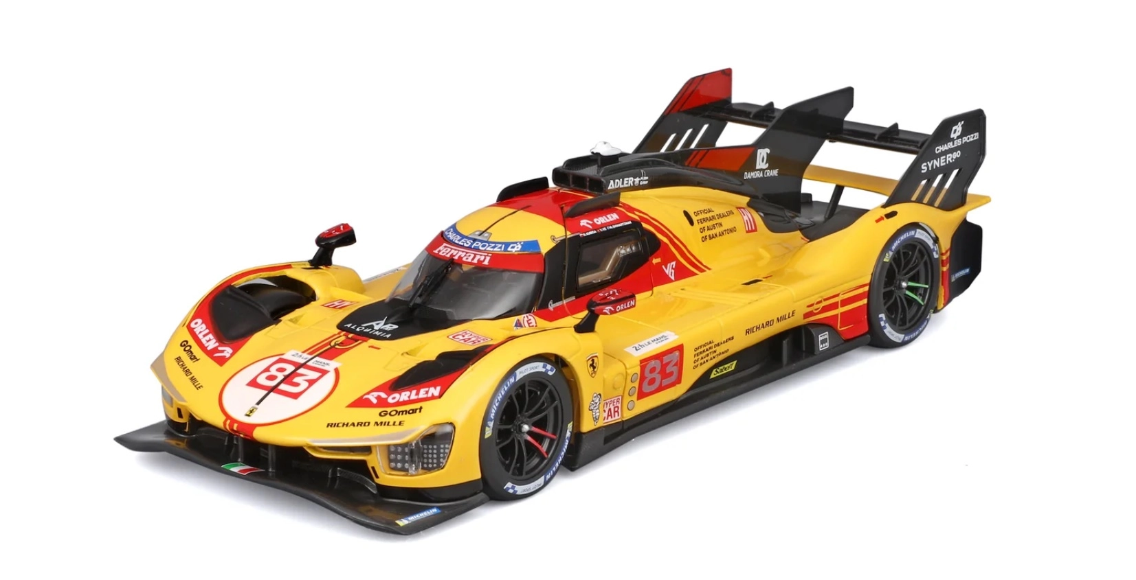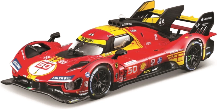 Model Ferrari 499P v merilu 1:43 znamke Bburago prinaša avtentične proporce, dirkaško grafiko in skrbne podrobnosti, navdihnjene z nastopom vozila s številko 83 na 24h Le Mans 2024. Zahvaljujoč prozornemu hardcase ohišju je idealen za varno razstavljanje in zaščito pred prahom.