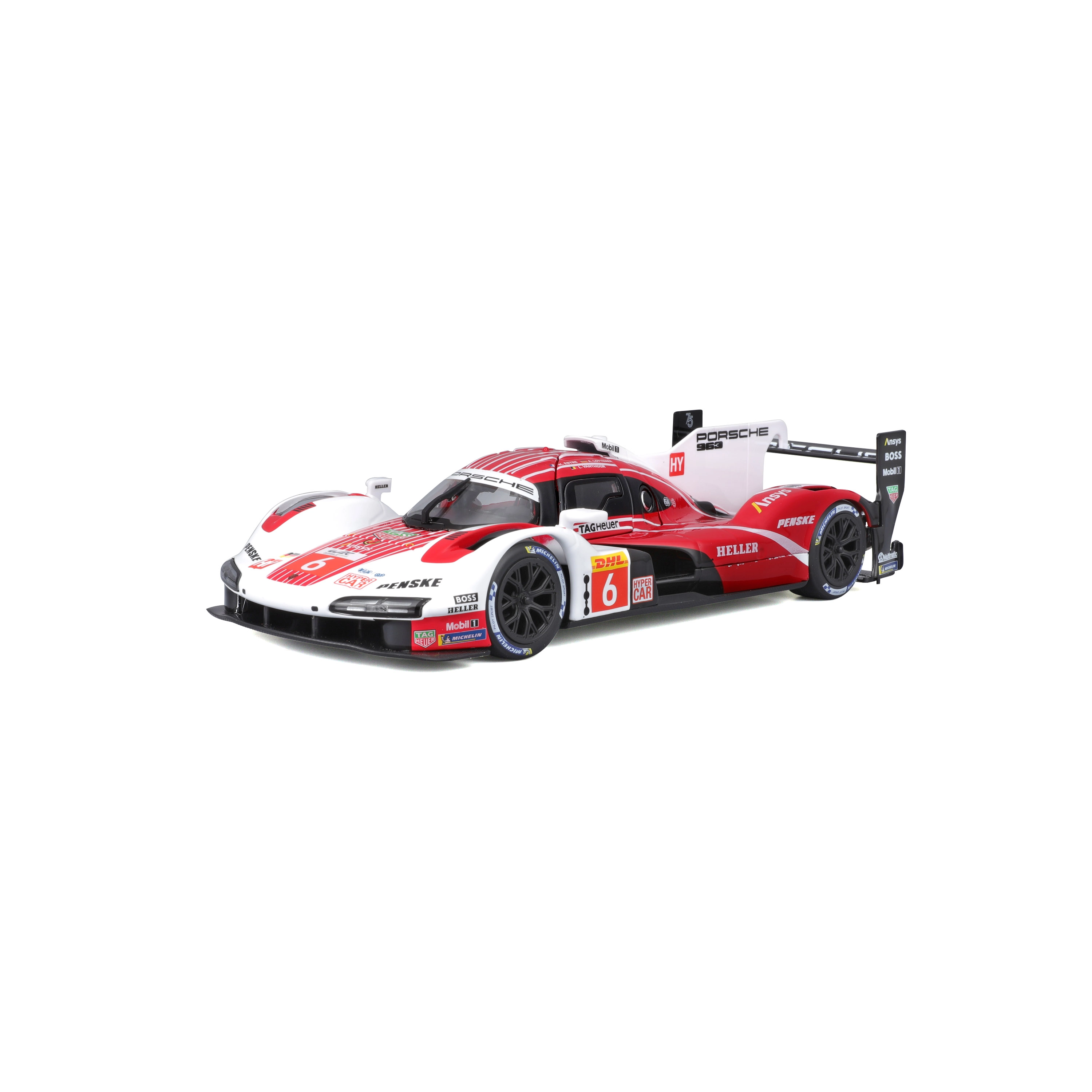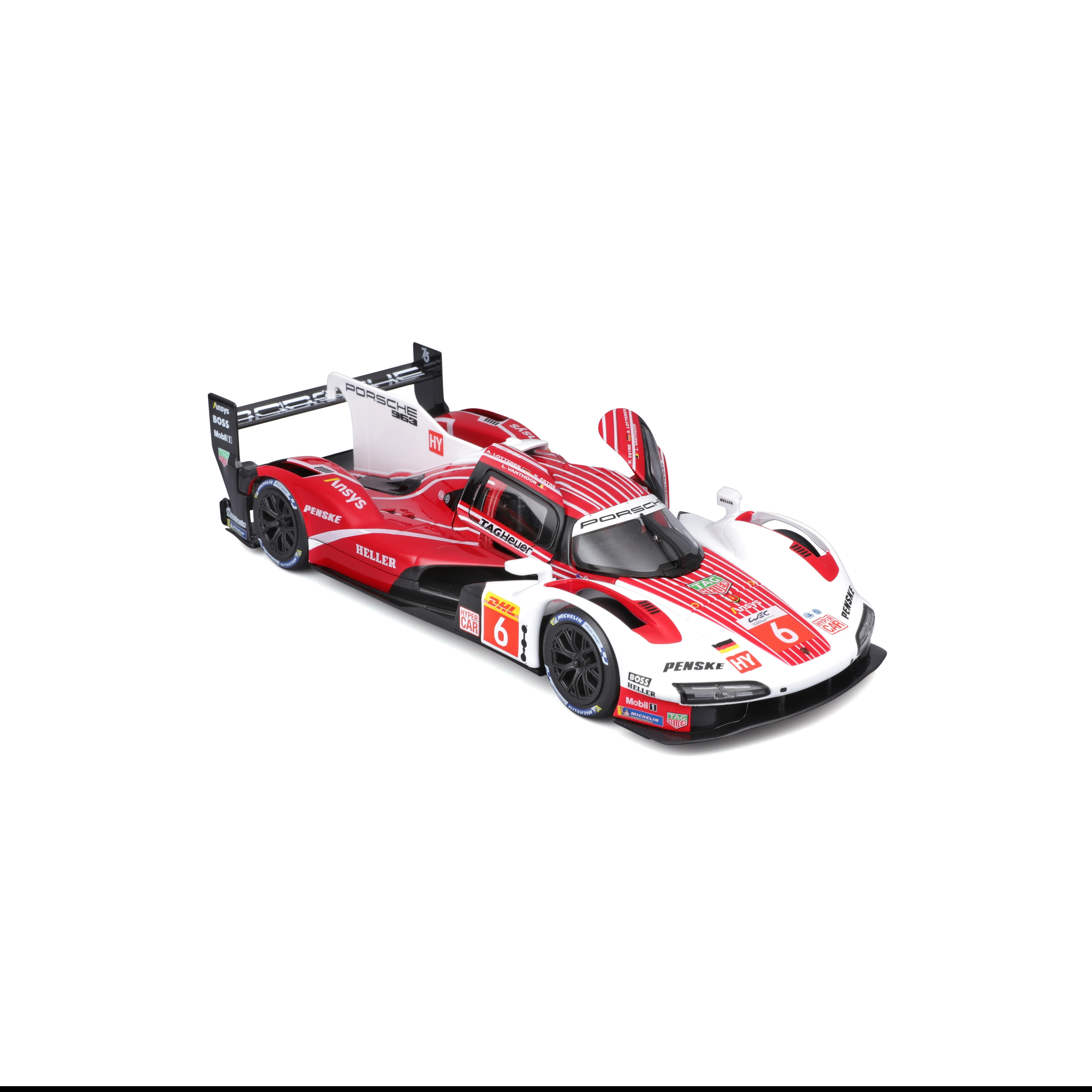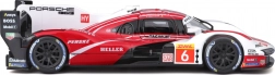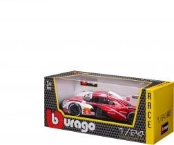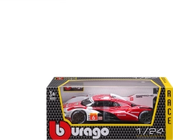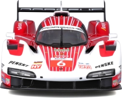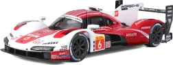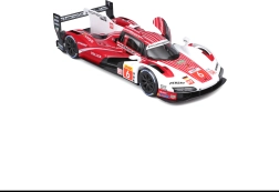 Model Bburago 1:24 zvesto ujame značaj vztrajnostnega prototipa PORSCHE 963 (2024) v dirkalni rdeče-belo-črni barvni shemi s sponzorskimi logotipi. Kovinska karoserija s plastičnimi dodatki, natančne linije in avtentični aerodinamični elementi poudarjajo zbirateljsko vrednost in razstavni videz.