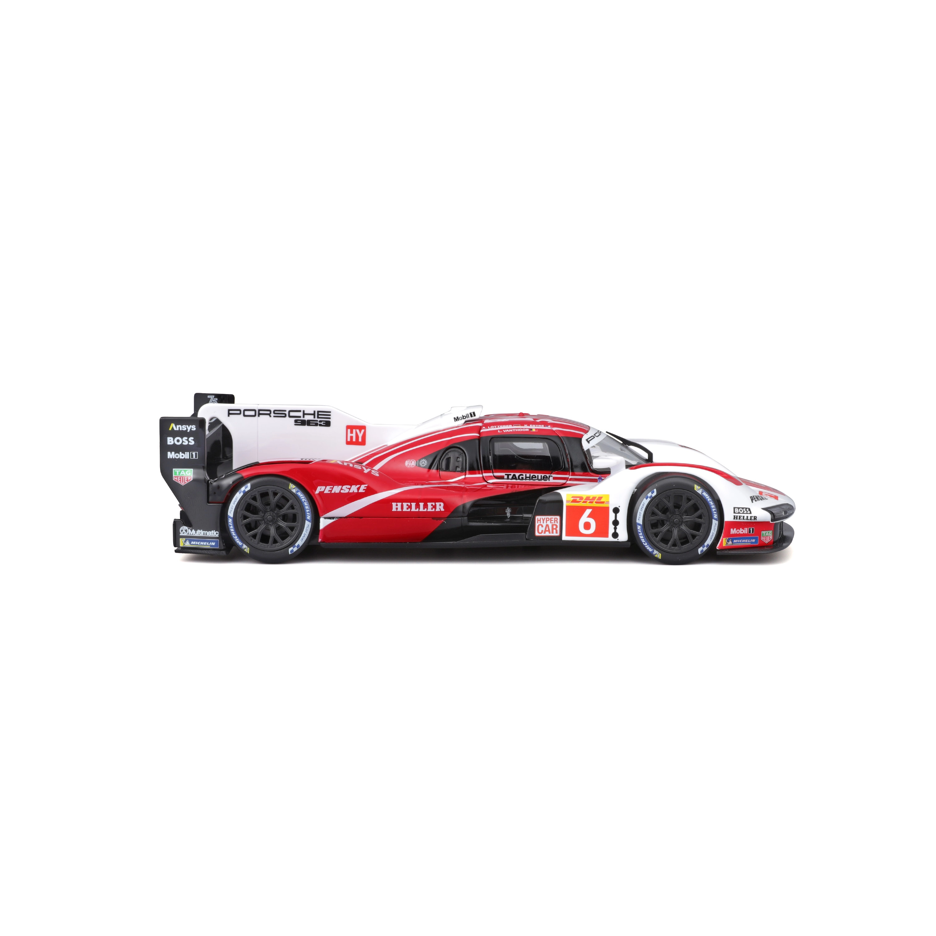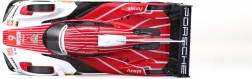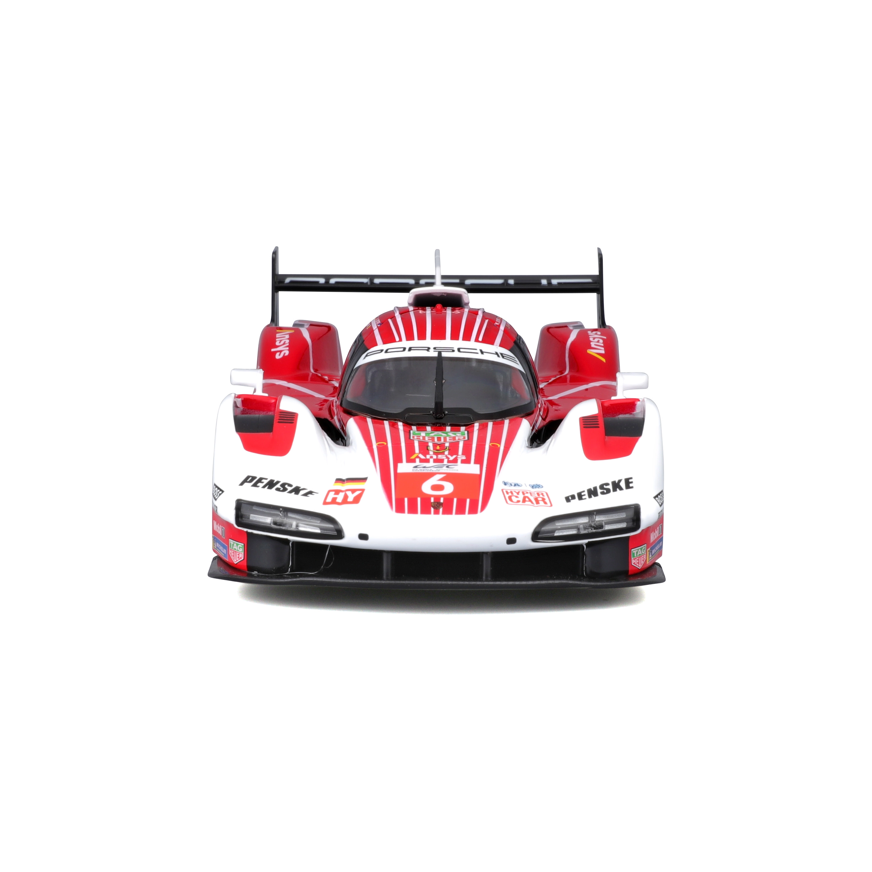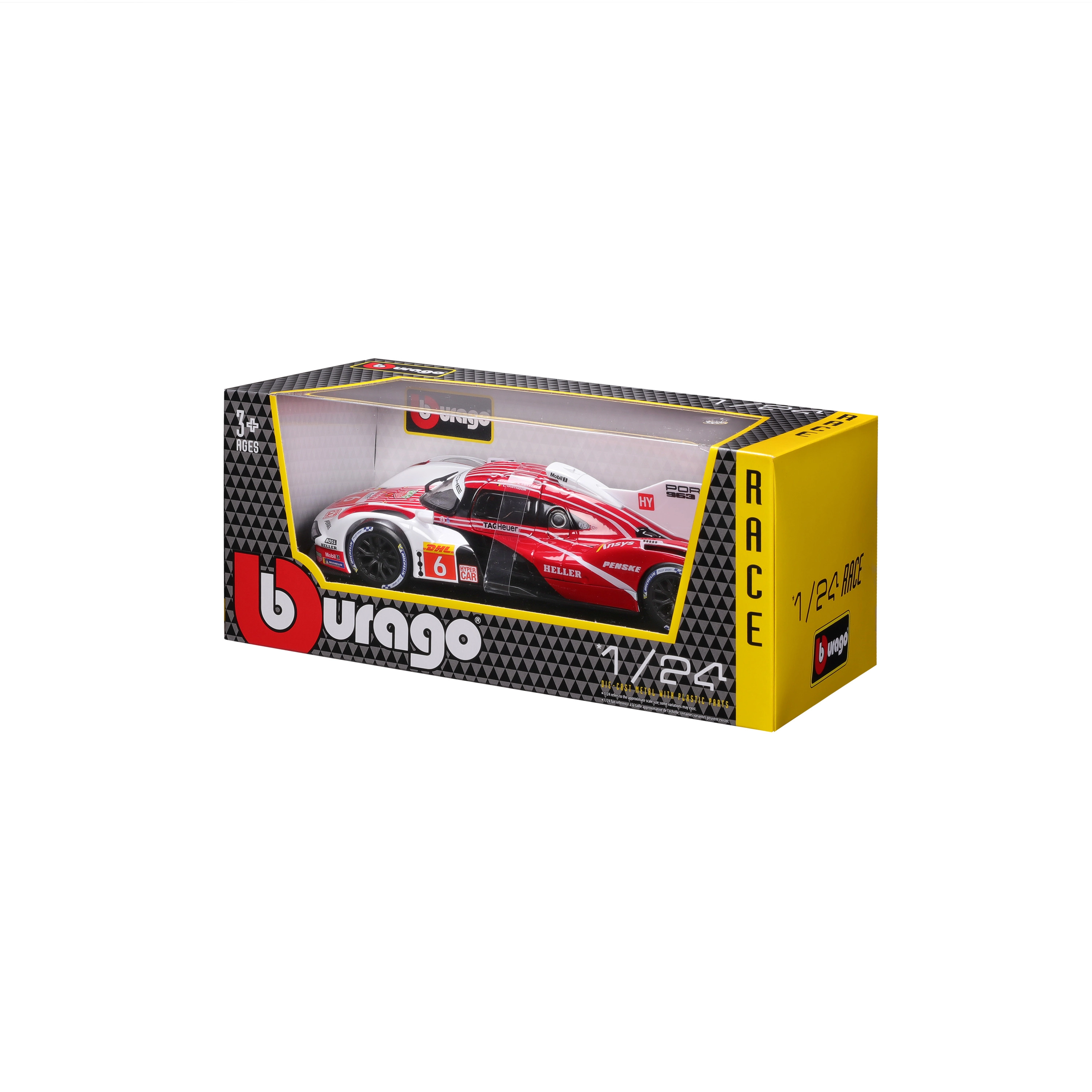 Model Bburago 1:24 zvesto ujame značaj vztrajnostnega prototipa PORSCHE 963 (2024) v dirkalni rdeče-belo-črni barvni shemi s sponzorskimi logotipi. Kovinska karoserija s plastičnimi dodatki, natančne linije in avtentični aerodinamični elementi poudarjajo zbirateljsko vrednost in razstavni videz.