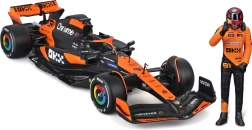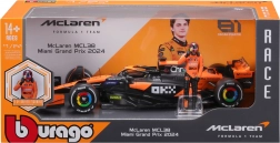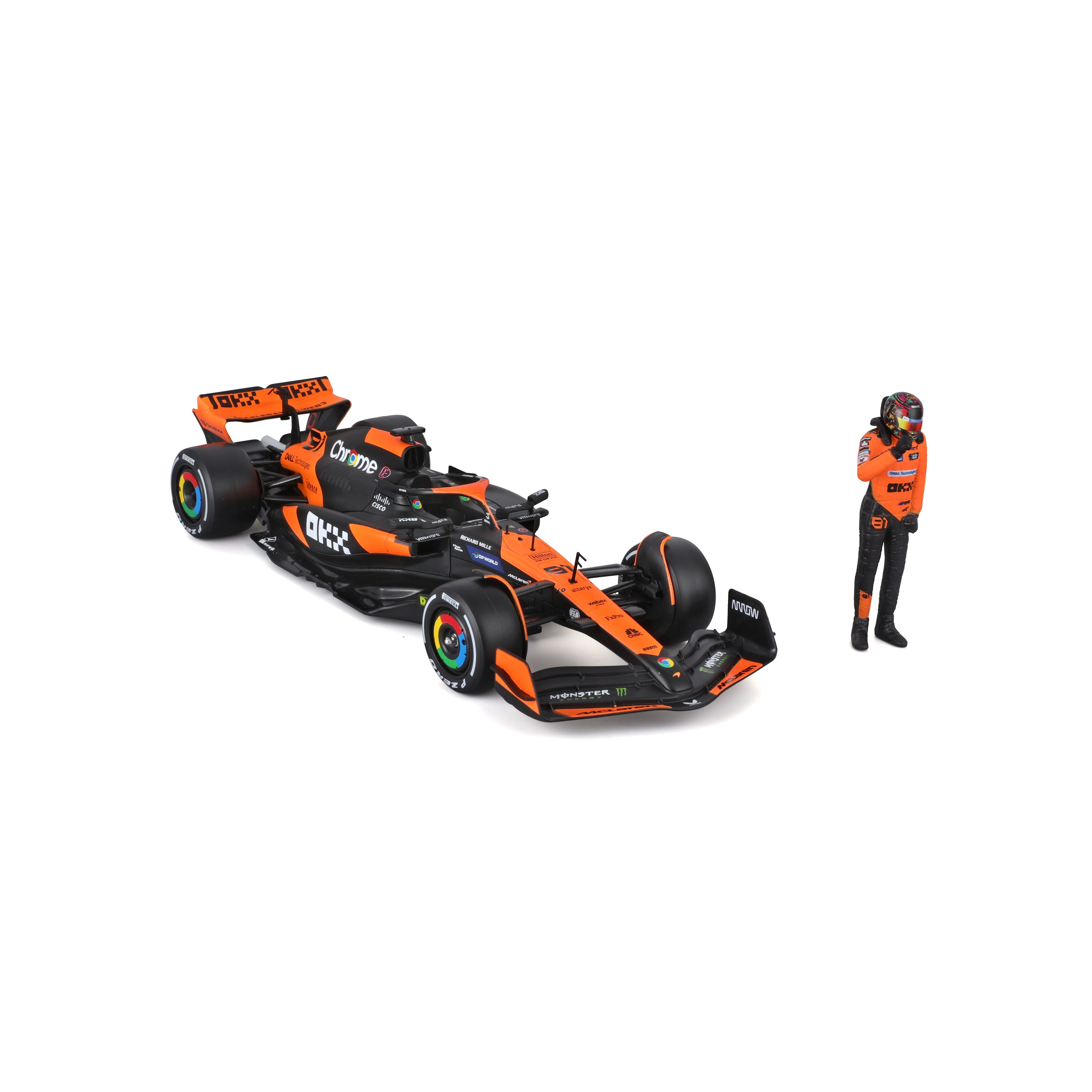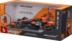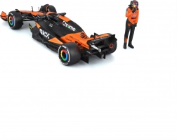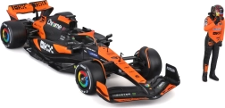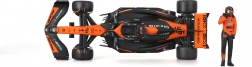 Natančen potisk sponzorjev, oranžno‑črna barvna shema ter podrobna krilca, difuzor in halo za avtentičen videz enosedežnika McLaren MCL38.