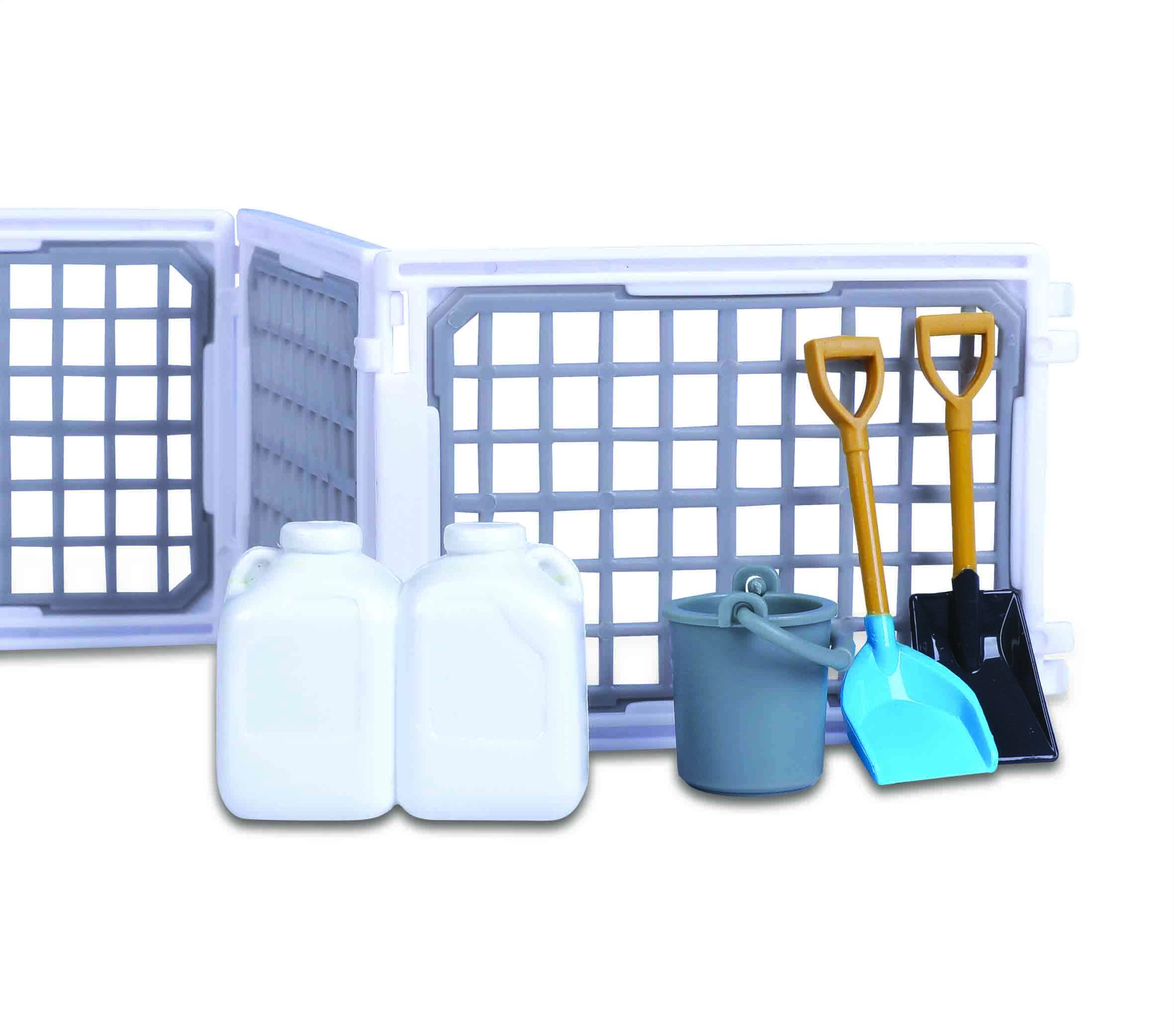 Lopate, grablje, vedra in kanistri pomagajo pri vzdrževanju ograde. Otroci bodo preizkusili hranjenje, čiščenje in skrb za živino kot na pravi kmetiji.
