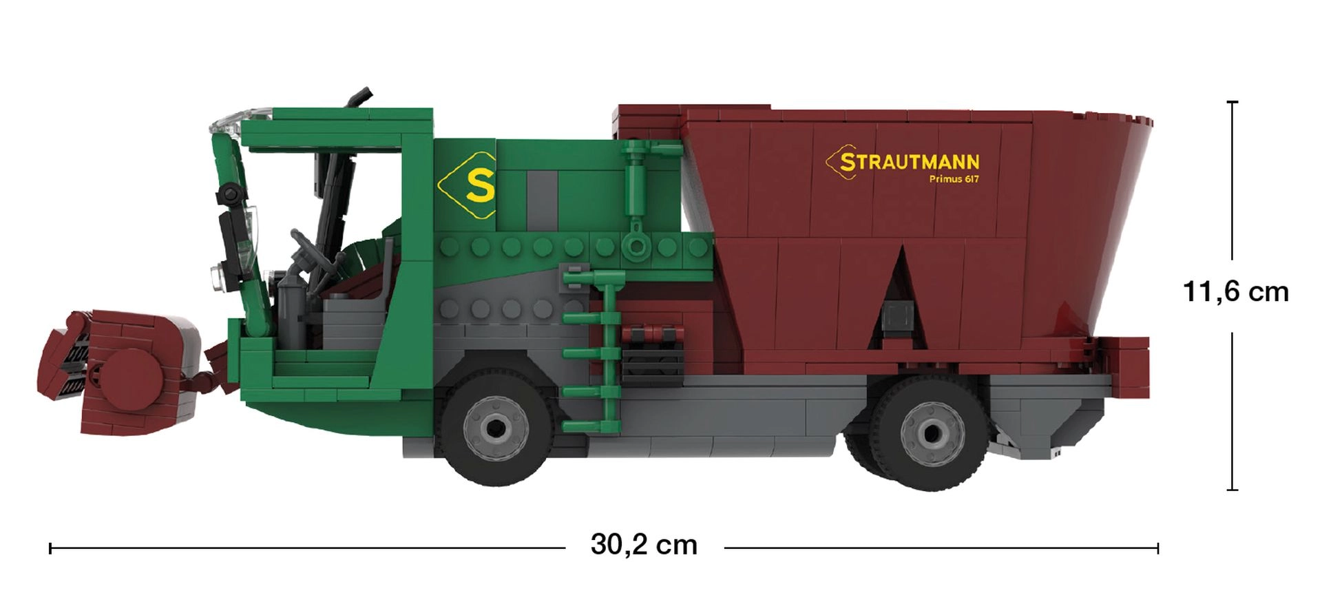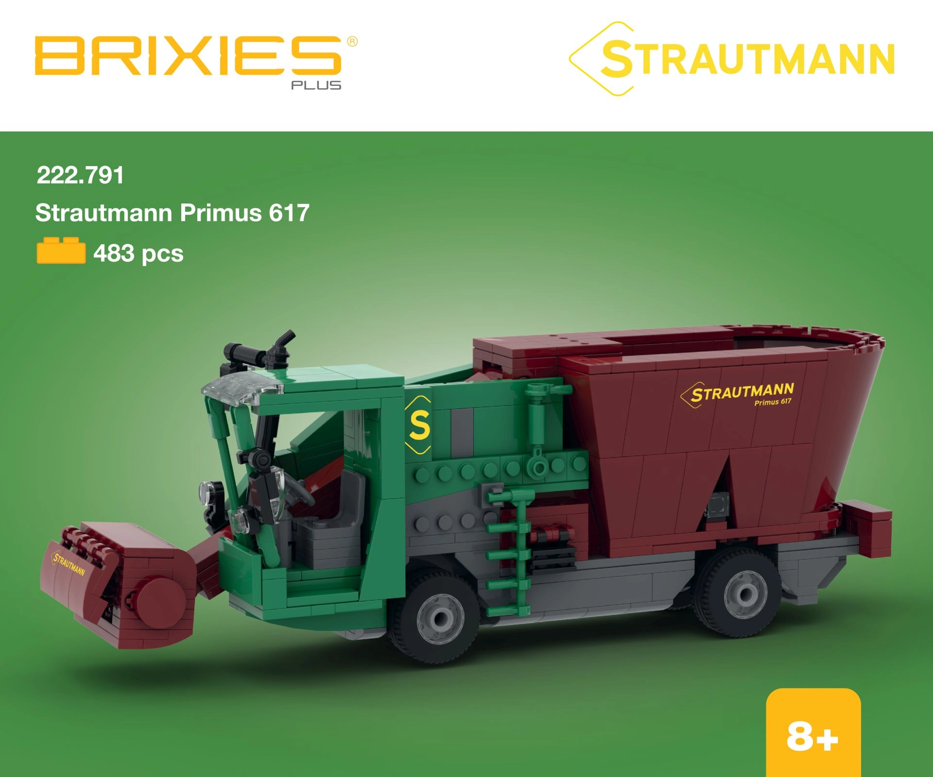 Zgradite podroben model mešalnega krmnega voza STRAUTMANN PRIMUS 617 iz serije BRIXIES Plus. Sestavljanka s 483 kosi verno prikazuje značilne elemente pravega stroja in po sestavi meri približno 30,2 × 11,6 × 9 cm (d × v × š). Zaradi večjih kosov je primerna za otroke od 6–8 let in je združljiva z drugimi sestavljankami iz kock podobnega tipa.