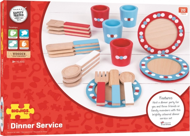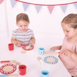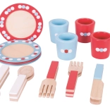Ta barvit leseni jedilni komplet je zasnovan za mlade začetnike, ki želijo pripraviti lastne večerje in organizirati čajanke. Odličen dodatek vsaki leseni igralni kuhinji, komplet vsebuje: