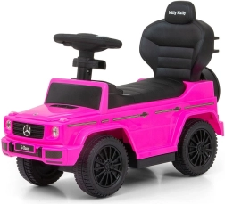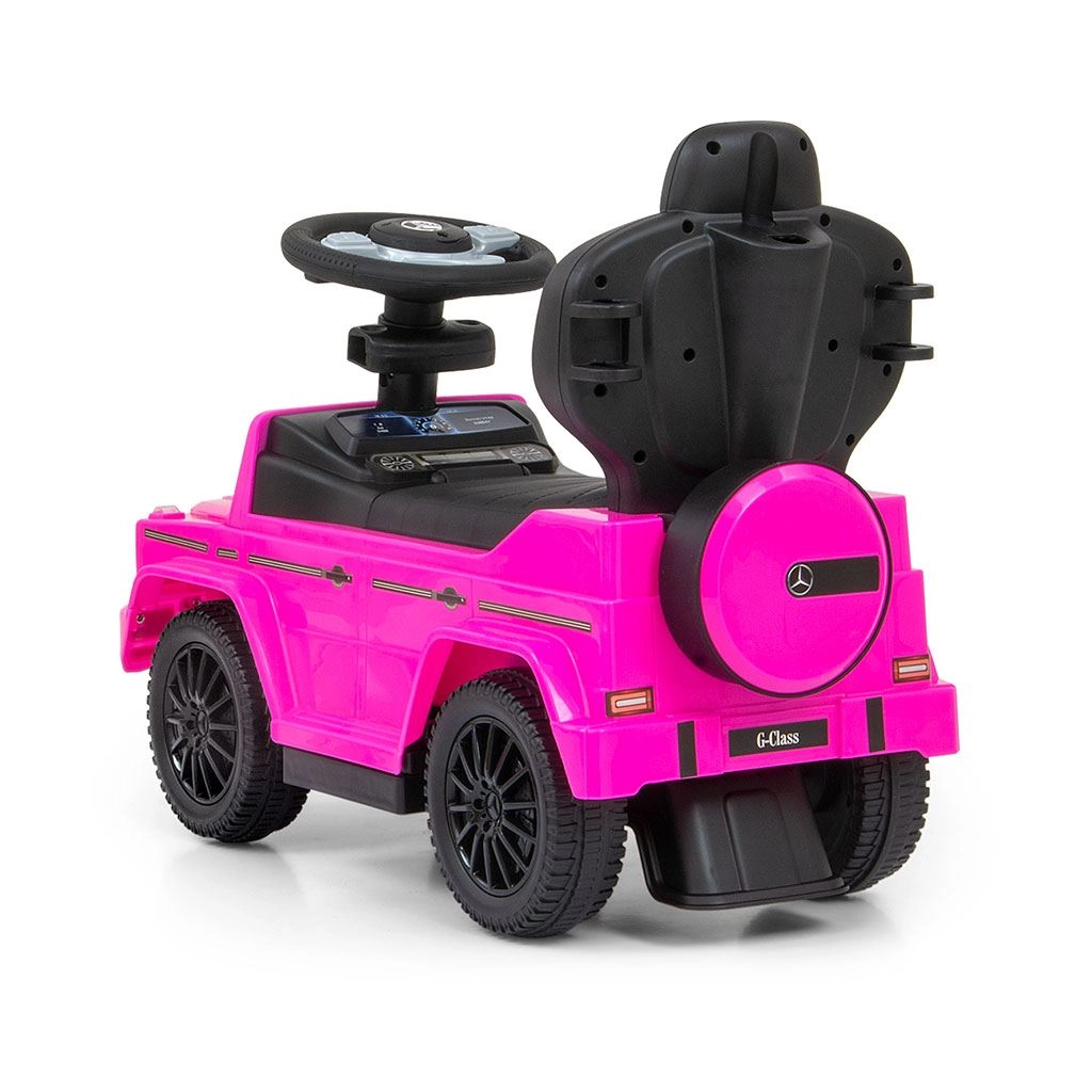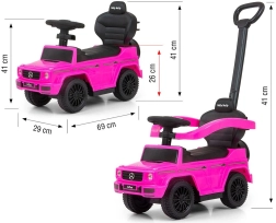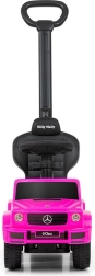 Licencirani poganjalec MERCEDES G350d v rožnati barvi izgleda kot pravi terenec ter spodbuja otroke k aktivnemu gibanju, urjenju ravnotežja in motorike. Zahvaljujoč visokemu naslonu, stranskim naslonom in vodilni palici je primeren za otroke, ki že znajo sedeti, pa tudi za male sprehajalce. Po odstranitvi vodilne palice, naslonov za roke in stopalk se spremeni v klasični poganjalec.