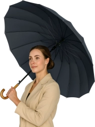 Eleganten in izjemno vzdržljiv dolgi dežnik z 24 ojačanimi rebri združuje klasičen slog, visoko stabilnost v vetru in udobje samodejnega odpiranja. Velika strešica 115 cm zanesljivo zaščiti posameznika ali par, vodoodporna in hitro sušeča tkanina olajša vzdrževanje, lesen ukrivljen ročaj pa doda brezčasen videz. Priloženo je tudi ohišje s paščkom za nošenje čez ramo za udobno prenašanje.