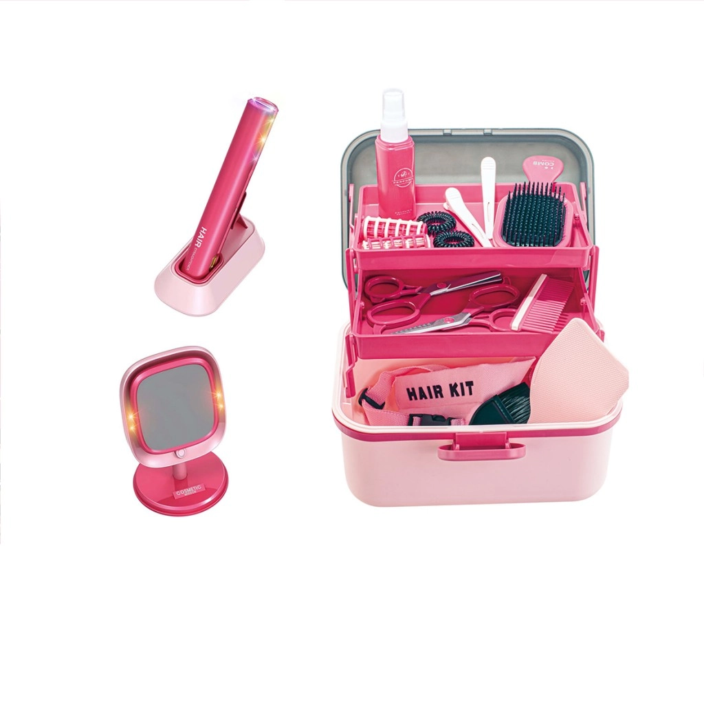 - Otroški likalnik za lase, polnilno stojalo, namizno ogledalo s svetlobnimi učinki, kovček s predelki, glavniki, krtače, škarje, sponke, sprej (igrača)