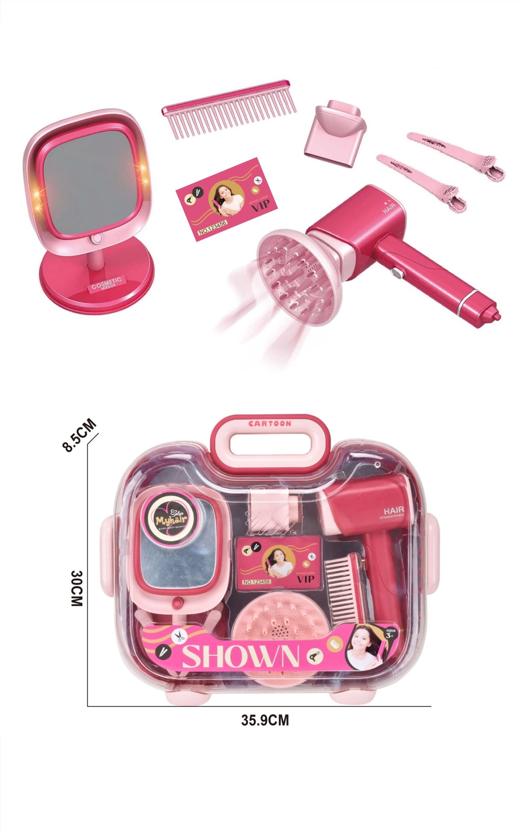 Frizerski studio za otroke z ogledalom in sušilnikom je zabaven in bogato opremljen set za male razvajenke. Realističen rožnat sušilnik z difuzorjem ponuja svetlobne in zvočne učinke, zato deluje kot pravo frizersko orodje. Del kompleta je tudi stoječe ogledalo s stransko osvetlitvijo na stabilnem podstavku v rožnato-vijoličnih tonih.