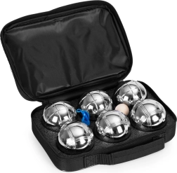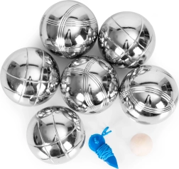Set vsebuje 6 trpežnih krogel iz kromiranega jekla s premerom 72 mm in težo približno 700 g za udoben in stabilen met. Dva različna vzorca rebranja olajšata razlikovanje krogel med igro. Leseni cochonnet služi kot tarča, merilna vrvica pa pomaga pošteno razrešiti sporne situacije.