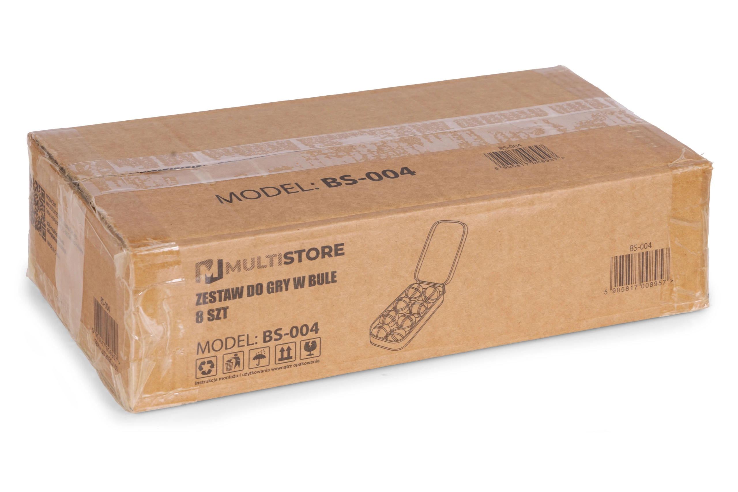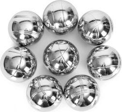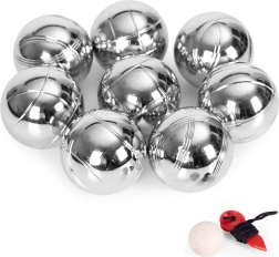 Komplet vsebuje 8 kromiranih jeklenih krogel z različnimi linijskimi vzorci za enostavno razločevenje igralcev. Vsaka krogla ima premer 72 mm in težo približno 700 g za zanesljiv oprijem in stabilen met. Priložena sta lesen cochonnet in merilna vrvica za natančno določanje, katera krogla je najbližje – poštena igra brez prerekanja.