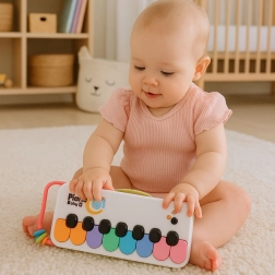 Odlično kot prva glasbena igrača – je trpežen, preprost za uporabo in prilagojen otrokom od najzgodnejše starosti. Barvite tipke s črnimi gumbi vabijo k odkrivanju zvokov in ustvarjalni igri, doma, v vrtcu ali na poti.