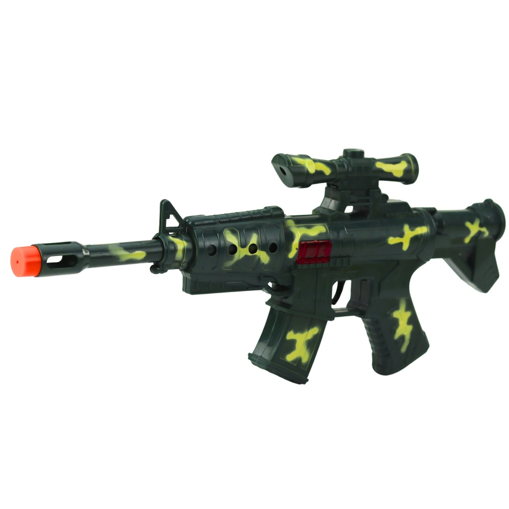 Ob pritisku na sprožilec se zasliši izrazit mehanski efekt strela, ki okrepi vzdušje igre. Plastična konstrukcija s kamuflažnimi detajli je lahka in varna za otroke.