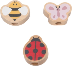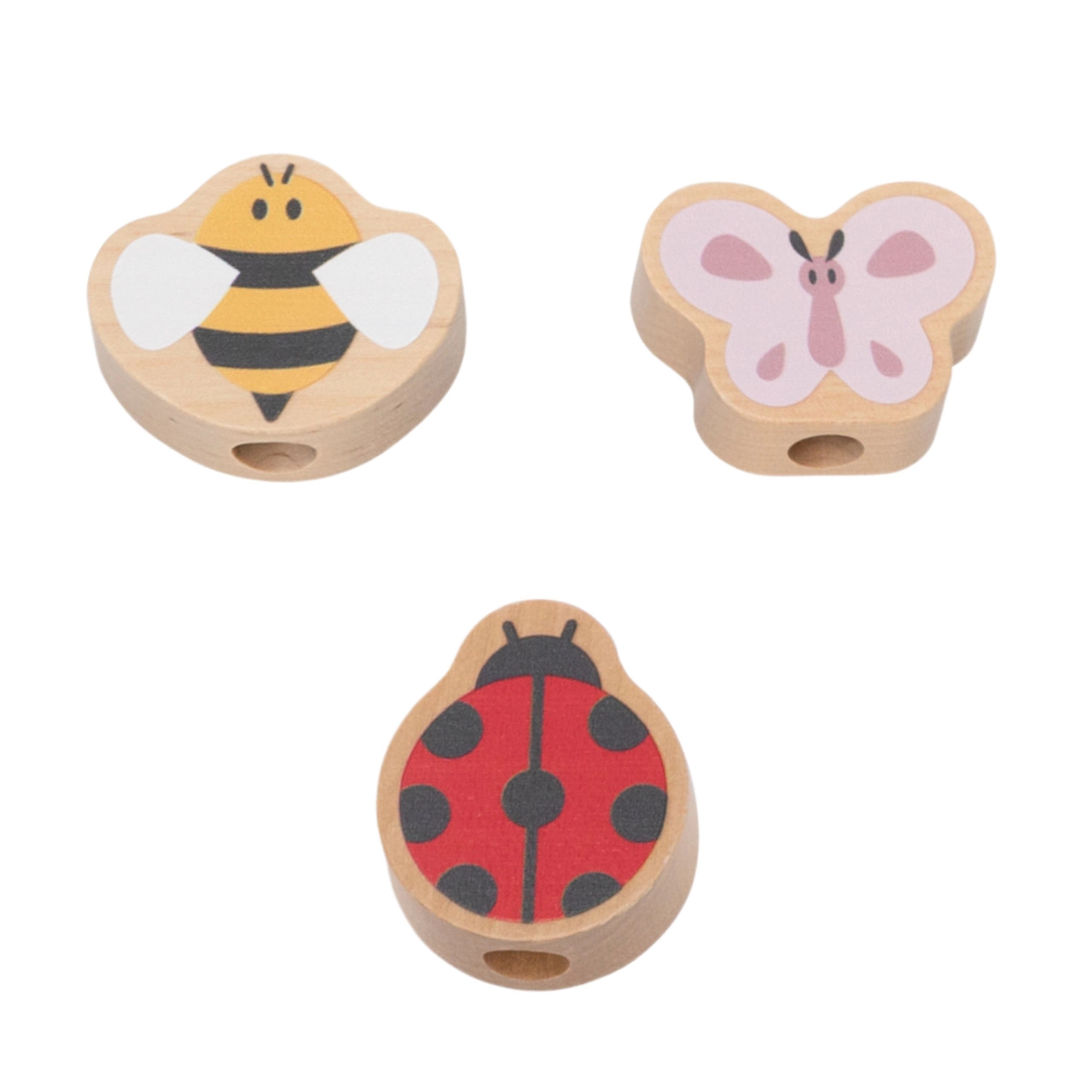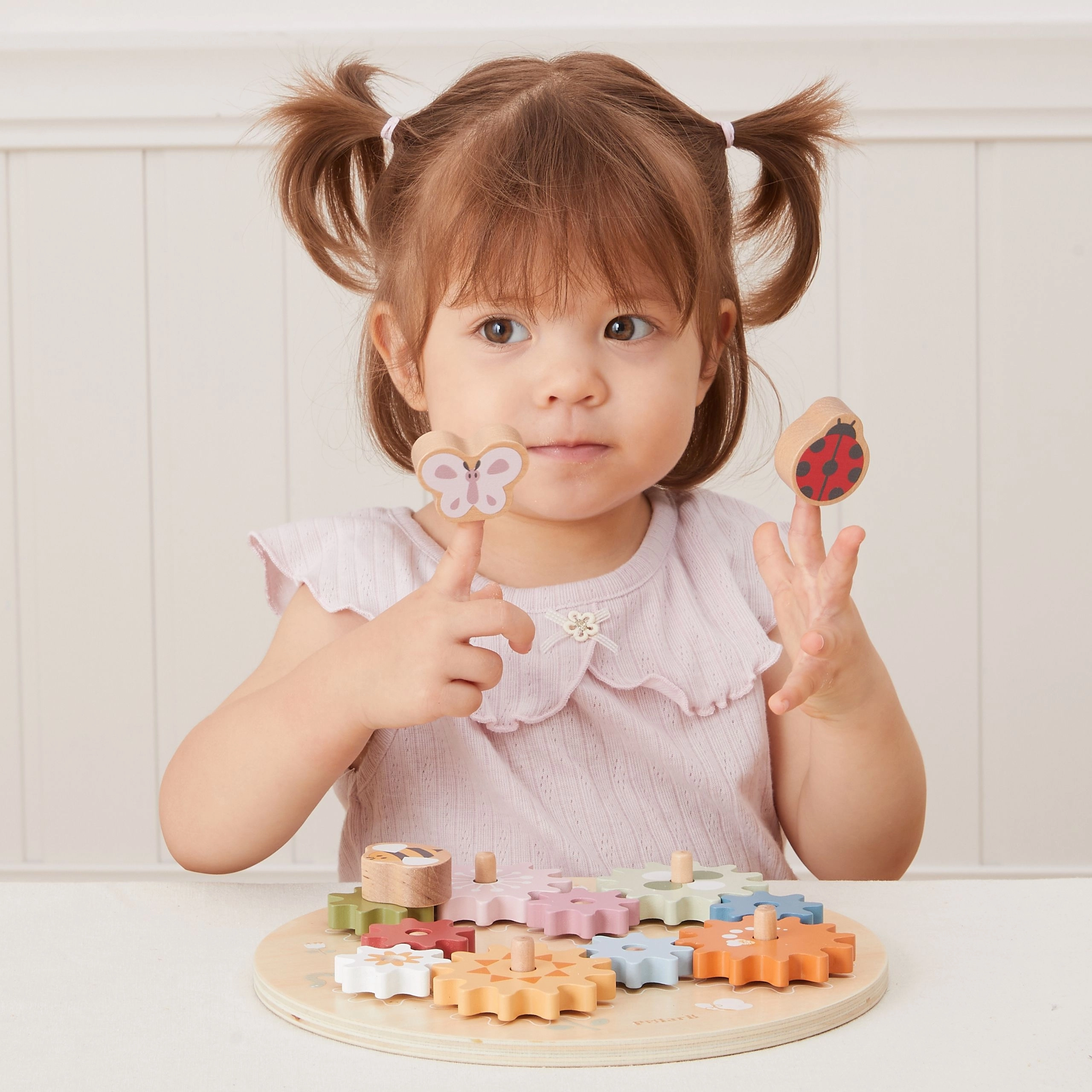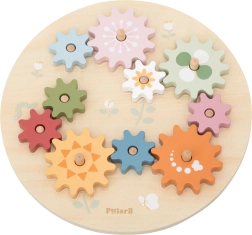 Ta kakovostna lesena igrača je zasnovana za male raziskovalce od 18 mesecev dalje. Otroci zlagajo in povezujejo zobnike na zatiče tako, da se med seboj ujemajo in se ob vrtenju zavrtijo vsi hkrati. Nežne pastelne barve, motivi metulja, pikapolonice in čebele ter gladka obdelava vabijo k varni in smiselni igri.