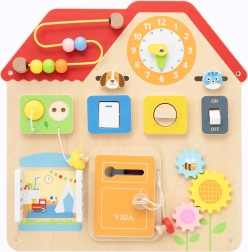 Odkrijte čar pametne igre z leseno tablo v obliki hišice, ki otroke vabi k raziskovanju in urjenju veščin. Premišljeni elementi, kot so drsniki, ključavnica s ključem, zobniki in labirint z jagodami, naredijo tablo za vsestransko pomoč pri razvoju motorike, potrpežljivosti in radovednosti.