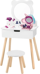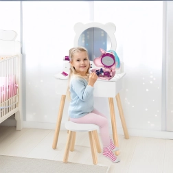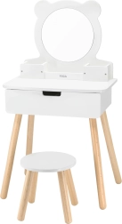 Podarite otrokom njihov lastni kotiček lepote. Bela lesena toaletna mizica Viga z okroglim ogledalom in izvlečnim predalom nudi dovolj prostora za vse zaklade. Pod ogledalom so praktični razdelki za vsakodnevne dodatke, priložen pa je tudi udoben stolček za prijetno sedenje.
