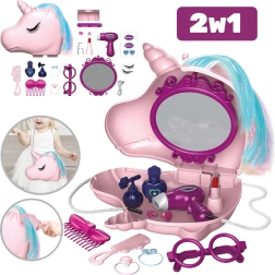 Komplet vključuje tudi torbo s samorogom z bogato opremo za igro frizerskega in kozmetičnega salona. Otroci lahko preizkusijo ličenje, česanje in sušenje – igrača sušilnik piha zrak – ter stilirajo “grivo” samoroga. Ta igra spodbuja ustvarjalnost, fino motoriko, domišljijo in koordinacijske veščine.