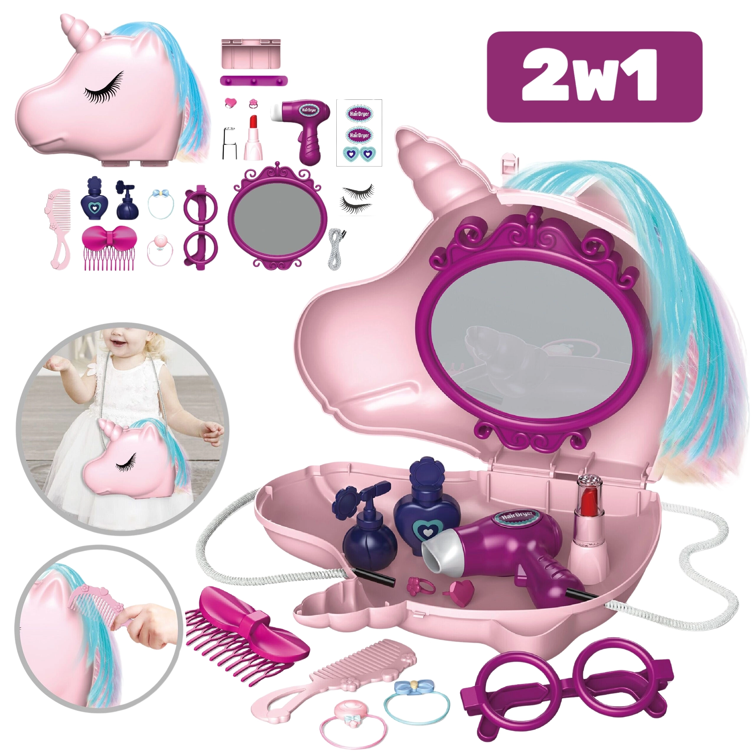 Vključena je torba s samorogom z 19 kosi dodatkov: sušilnik za lase, ki piha zrak, ogledalce, glavniki, sponke, “parfumi”, šminka in drugo.