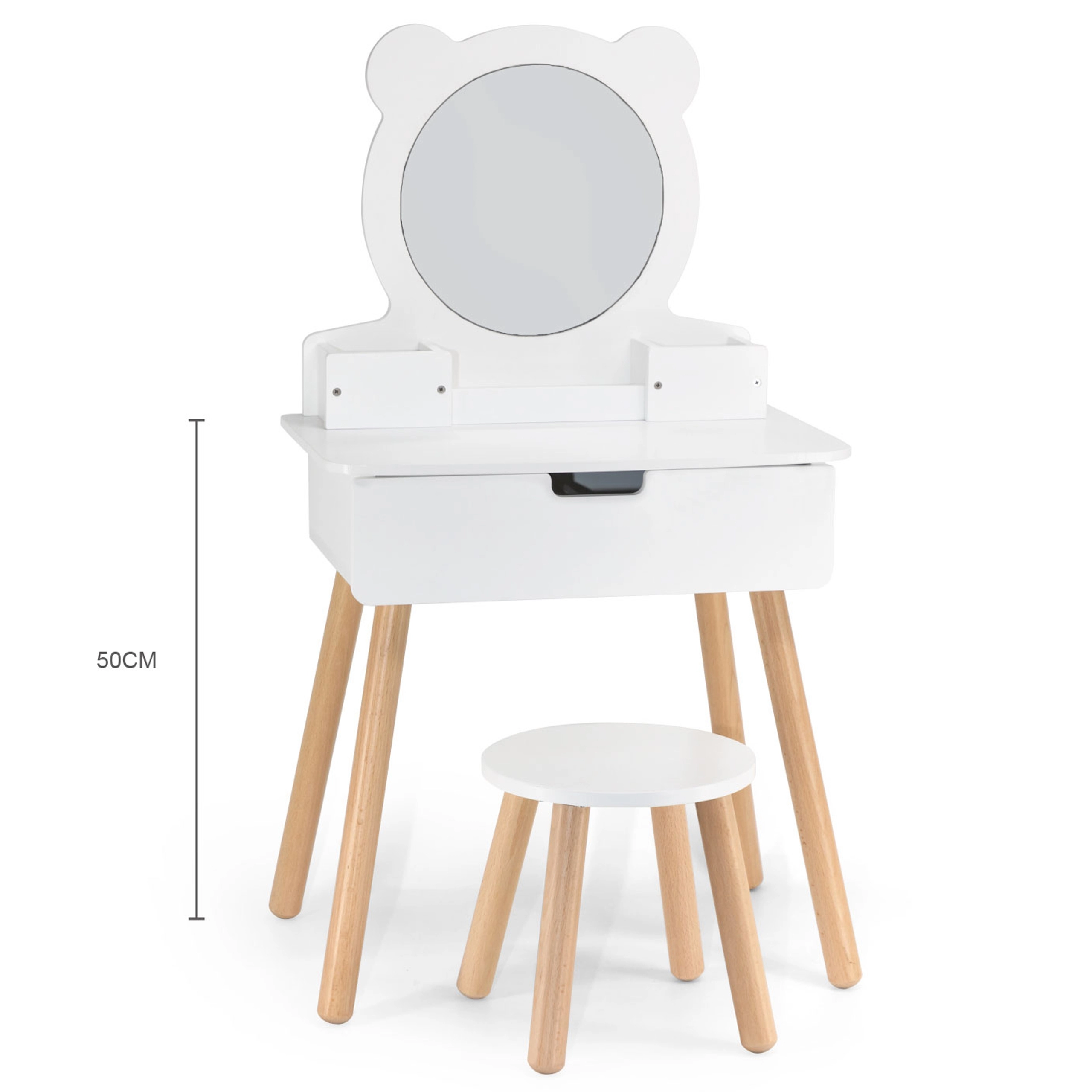 Trdna lesena konstrukcija, okroglo ogledalo z “medvedjimi ušeski”, praktičen predal in razdelki poskrbijo, da so vsi dodatki vedno na svojem mestu.