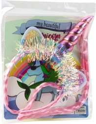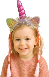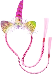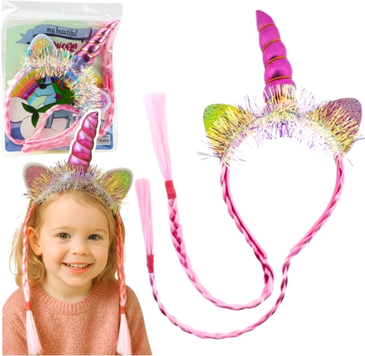 Čaroben rožnat naglavni trak v slogu samoroga z rogom, ušeski in dolgimi kitkami je idealen za otroke in odrasle. Odlično pristaja zaradi univerzalne velikosti, je udoben za nošenje in vsakemu outfitu doda magičen videz – za zabave, fotografiranje, pustne dogodke in vsakodnevno popestritev.