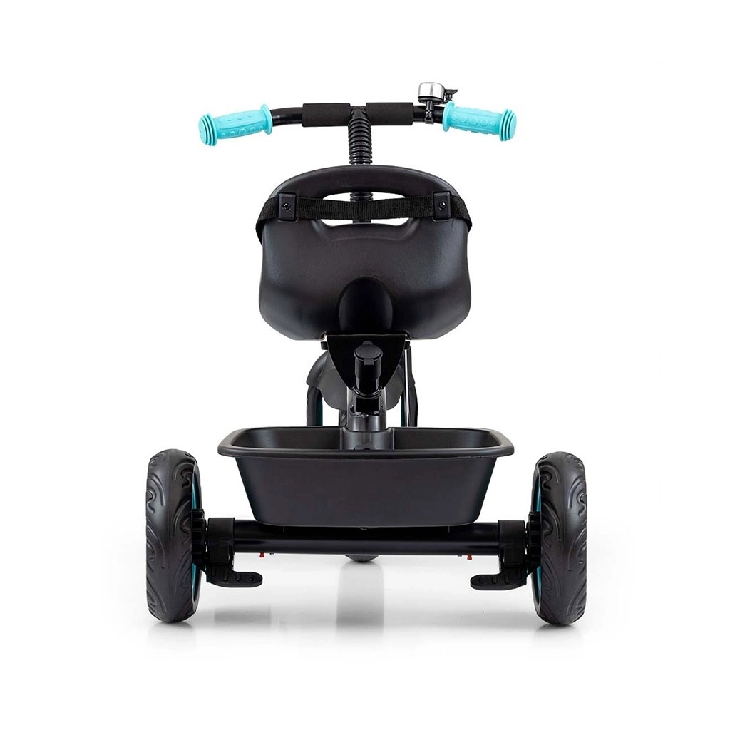 3-točkovni pasovi z zaščitami držijo otroka trdno na sedežu, sprednji košek in zadnja kadica pa ponujata prostor za igrače in drobnarije.