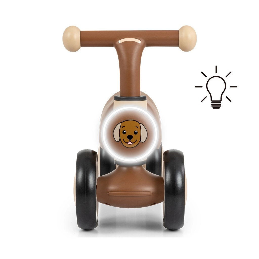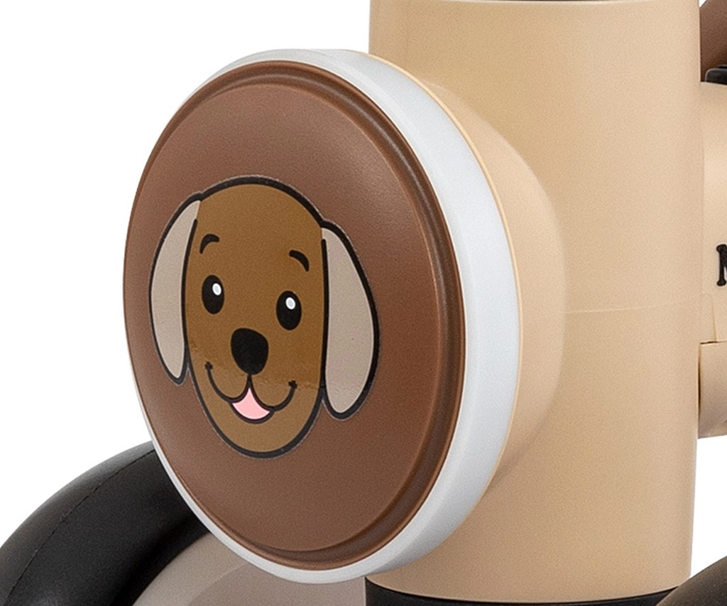 Starši bodo cenili hitro montažo, čvrsto konstrukcijo in največjo nosilnost 25 kg. Sprednja LED luč (na baterije) poveča vidnost in privlačnost, melodije in živalski zvoki pa vsako vožnjo spremenijo v veselo pustolovščino.