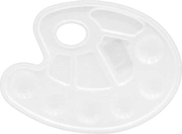 Praktična paleta za slikanje z akrilnimi, tempera in akvarelnimi barvami. Ponuja več vdolbin za mešanje barv, je lahka, dobro leži v roki in se preprosto čisti – idealna za šolarje, hobistične umetnike in začetnike slikarje.