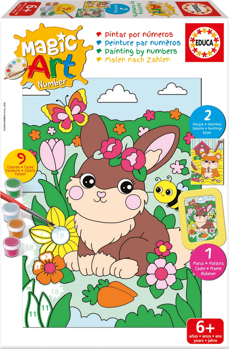 Odkrijte preprosto in zabavno slikanje s kompletom EDUCA Slikanje po številkah – Zajček in Hrček. Za trenutek postanite slikar in ustvarite svojo sliko po številkah. Komplet ponuja preprost postopek, razvoj zbranosti in koordinacije ter popolno opremo za takojšnje ustvarjanje.