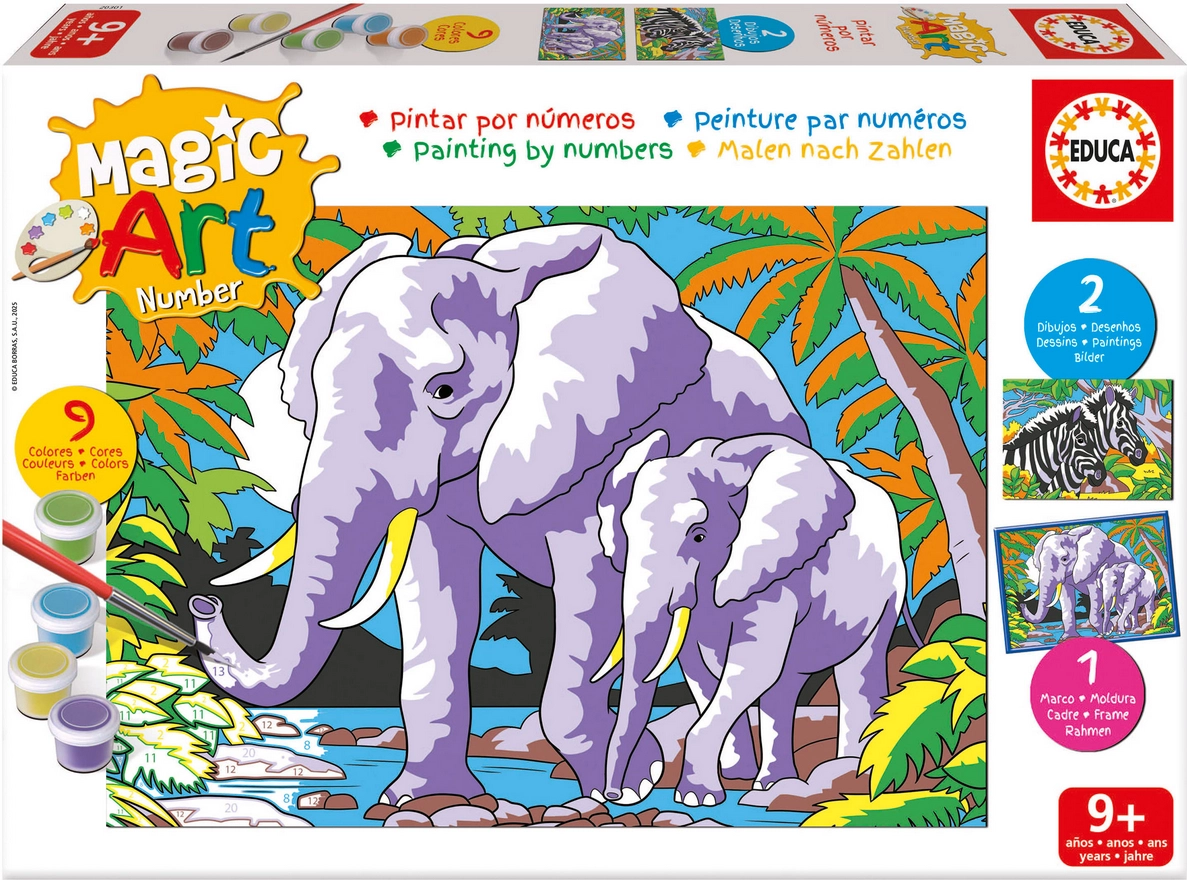 Odkrijte zabavno in sproščujoče slikanje po številkah z motivom slonov in zebr znamke EDUCA. Zaradi oštevilčenih delov platna je ustvarjanje slike preprosto tudi za začetnike in prinaša kreativno udejstvovanje za otroke in odrasle. Aktivnost razvija sposobnost osredotočanja, koordinacijske veščine in prepoznavanje barv, vse to na zabaven način.