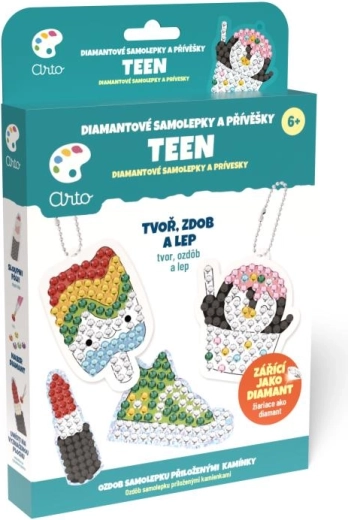 Spremenite ideje v bleščeče dekoracije! Ustvarjalni set ARTO omogoča otrokom preprosto izdelavo izvirnih obeskov in nalepk. Dovolj je slediti predlogi, lepite drobne "diamante" na označena mesta in v hipu nastanejo sijoče stvaritve, ki bodo krasile nahrbtnik, peresnico ali služile kot ljubko darilo.