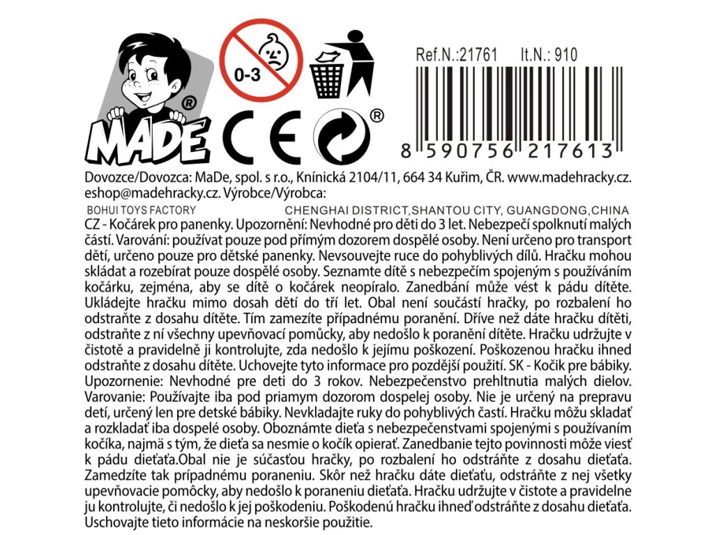 Lahek in stabilen otroški voziček za punčke tipa »golf« za deklice od 3 let. Ponuja enostavno upravljanje, vzdržljiv plastičen okvir in dovolj prostora za punčke. Na voljo v 4 barvnih različicah, pakirano na header kartici za preprosto razstavljanje.