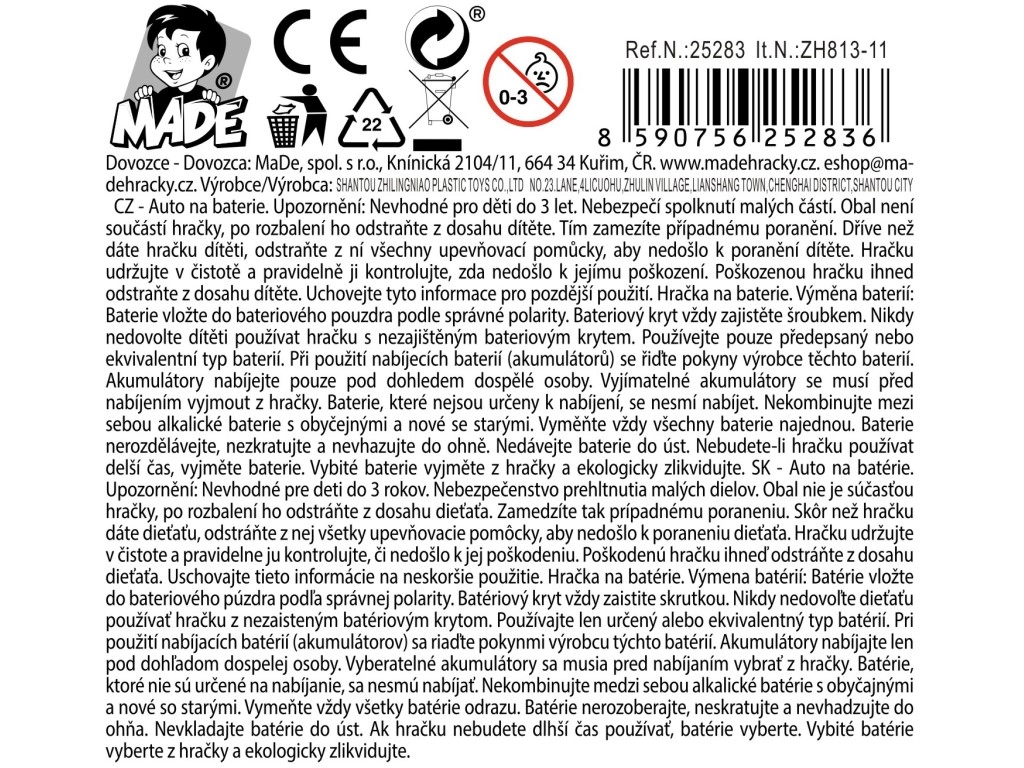 Kakovostna plastična izdelava zagotavlja vzdržljivost in nizko težo, kar je idealno za otroške roke. Vozilce je na voljo v 2 barvnih različicah in se zaradi kompaktnih mer udobno prilega v nahrbtnik ali v roko malega voznika.