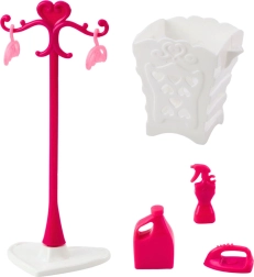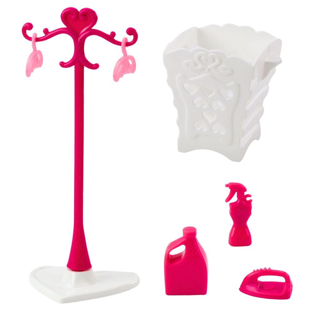 Vključuje sušilnik, koš za perilo, likalnik, razpršilko, stekleničko “praška” ter stojalo z obešalniki za popolno urejen igralni kotiček.