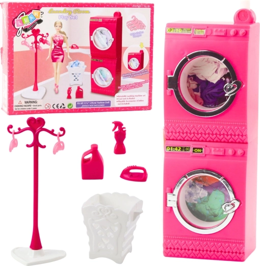 Roza pralnica za punčke – pralni stroj, sušilnik, stojalo z obešalniki in koš
