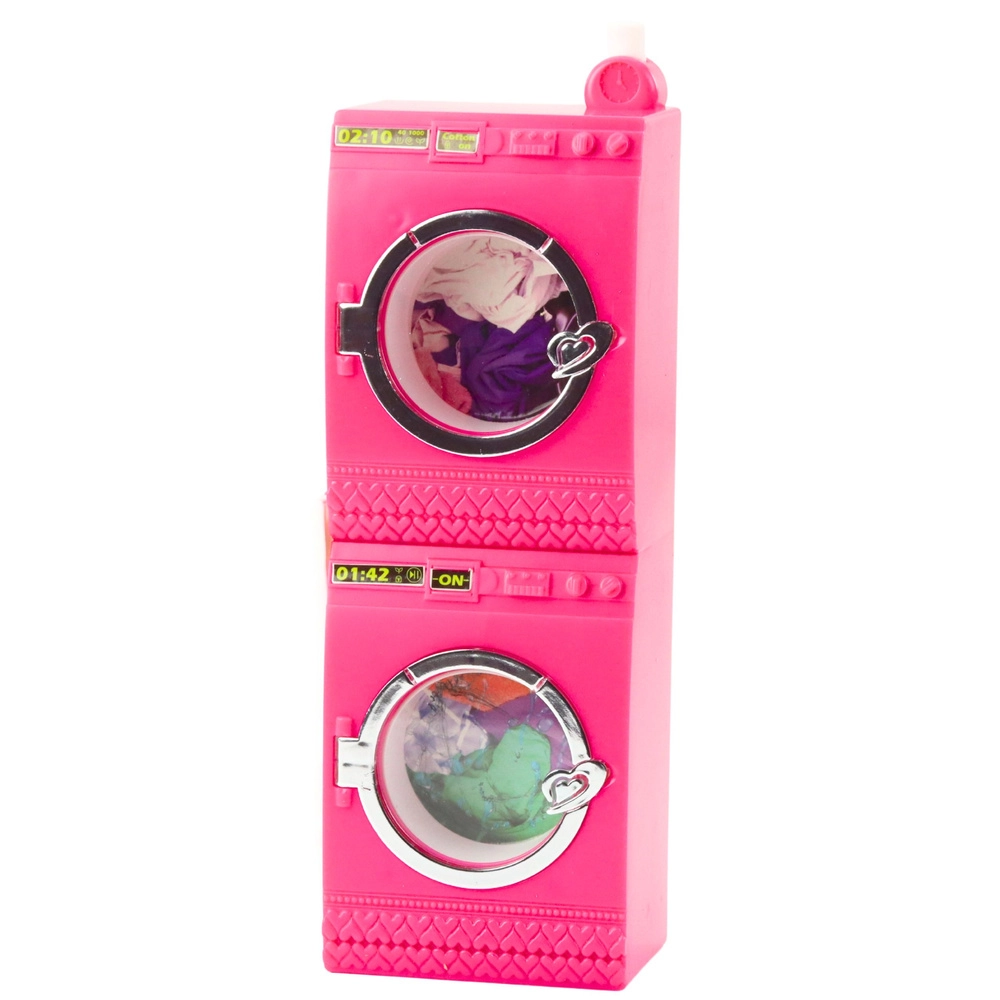Podarite otrokom njihovo lastno mini pralnico, ki zvesto posnema pravo domačo opremo. S pritiskom na gumb se v pralnem stroju zavrti boben, sušilnik dopolni nego “oblačil”, stojalo z obešalniki pa pomaga pri organizaciji. Rožnato-bela zasnova takoj pritegne pogled in vabi h kreativni igri.