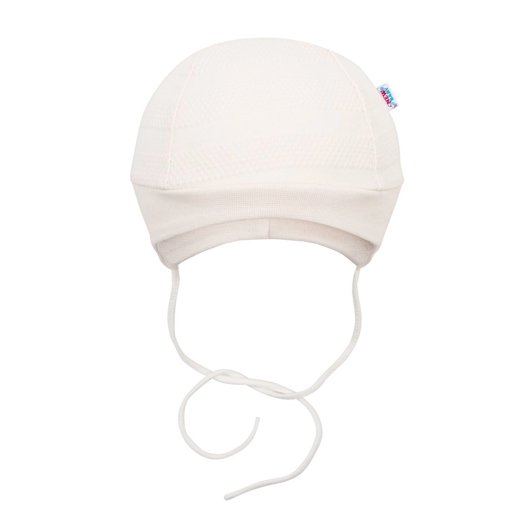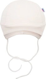 Lahka zapenjalna jopica dopolni opravilo, kapica na vezanje pa zanesljivo ščiti glavico in ušeska dojenčka.