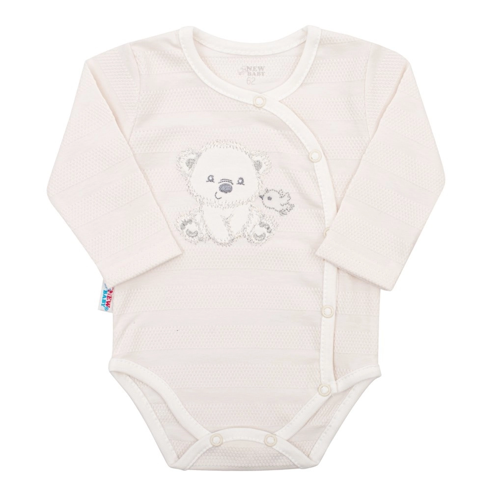 Kompleten 4-delni komplet za dojenčka blagovne znamke New Baby v nežni bež barvi. Vsebuje bodiji z zapenjanjem po celotni dolžini, pajace z zaprti stopali, jopico na pritiskače in kapico na vezanje. Mehki 100% bombaž, enostavno oblačenje s pritiskači in prikupna vezenina medvedka in ptička naredijo komplet idealen za porodnišnico in prve mesece.