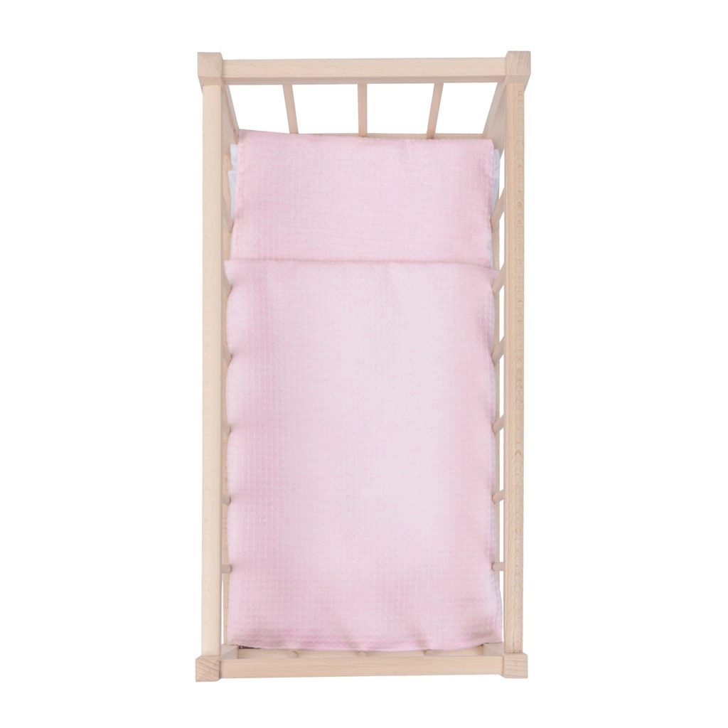 Ta lesena zibelka za punčke združuje naravni videz, varnost in veselje do igre. Gladko brušen les brez ostrih robov je nežen do otroških rok, čvrsta konstrukcija pa zagotavlja dolgo življenjsko dobo pri vsakodnevni igri. Del kompleta sta mehka vzmetnica in dvostranski komplet posteljnine v nežnih rožnatih tonih, ki se podajo vsaki otroški sobi.