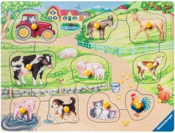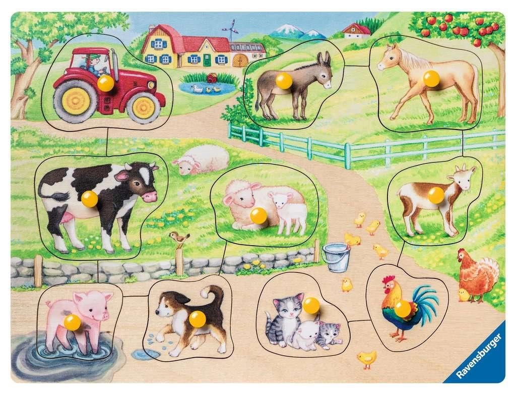 Lesena vstavljanka Ravensburger iz serije Moje prve lesene sestavljanke prinaša otrokom veselje do učenja skozi igro. Deset trdnih koščkov z ljubeznivo ilustriranimi motivi s kmetije pomaga razvijati ključne spretnosti in podpira pravilen prijem zahvaljujoč plastičnim ročajem na vsakem koščku.