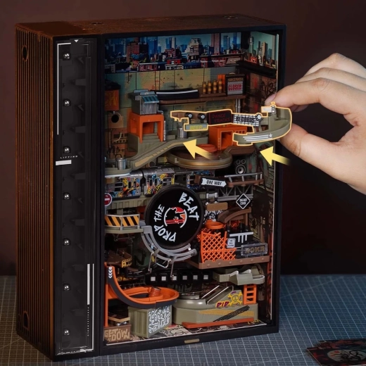 Miniaturni panoramski prizor utripajoče hip‑hop ulice prinaša gladko gibanje frnikol na stezi dolžine 233 cm, poudarjeno z dinamično neonsko LED osvetlitvijo. Zahvaljujoč učinkovitemu motorju z visokim navorom se frnikole zanesljivo vračajo s pomočjo samodejnega dvigala, zato lahko uživate v neprekinjenem spektaklu.