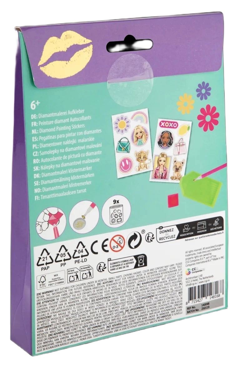 Ta kreativni komplet za diamantno slikanje nalepk prinaša preprost in sproščujoč način, kako izdelati bleščeče dekoracije. Dovolj je, da stresete kamenčke na pladenj, jih s pomočjo lepilnega kvadratka zajamete na aplikacijsko pero ter lepite na vnaprej natisnjene motive nalepk.