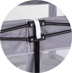 Montaža je hitra in intuitivna, vzdrževanje brezskrbno, in zahvaljujoč praktičnim dodatkom je ograjica pripravljena za vsakodnevno uporabo. Obročki za prijem pomagajo pri razvoju grobe motorike in varnem učenju stanja. Izdelek izpolnjuje strogi standard EN 12227:2010, zato se lahko zanesete na njegovo varnost.