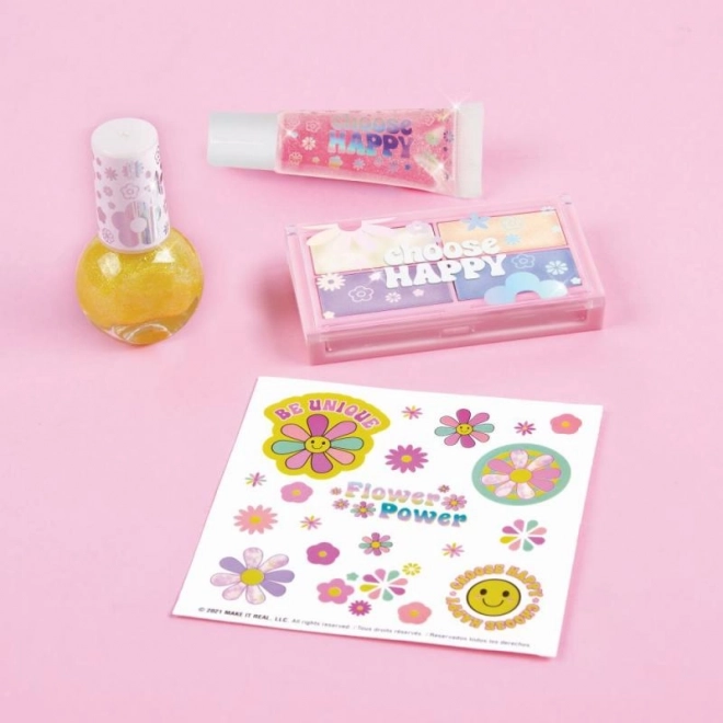 Paleta s štirimi barvami senčil za oči omogoča kombiniranje odtenkov glede na razpoloženje, lak za nohte in lipgloss pa dodata videzu nežen šarm. List nalepk razširi možnosti okraševanja in spodbuja kreativnost.