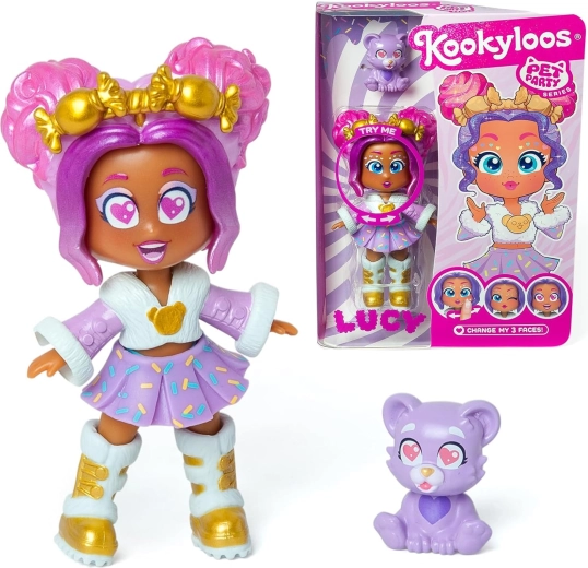 Odkrijte KookyLoos Lucy iz serije Pet Party – stilsko zbirateljsko punčko s tremi izrazi obraza, ki jih spremenite z zasukom glavice. Priložen je prikupen hišni ljubljenček – medvedek in modni dodatki za neskončne zgodbe in ustvarjalno igro. Idealno darilo za otroke, ki obožujejo živali, modo in domišljijo.