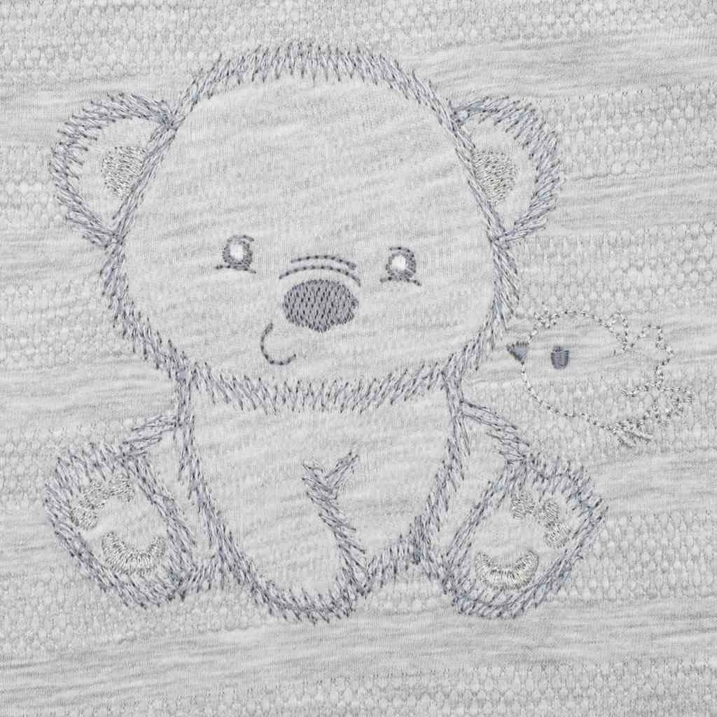 Ta eleganten novorojenčkov komplet je zasnovan za maksimalno udobje ter enostavno previjanje in oblačenje. Zahvaljujoč kakovostnemu bombažnemu jerseyju je set zračen, mehak in nežen do občutljive dojenčkove kože. Nežen siv dizajn z diskretnim vezenjem medvedka in ptička je primeren tako za punčke kot za fantke.