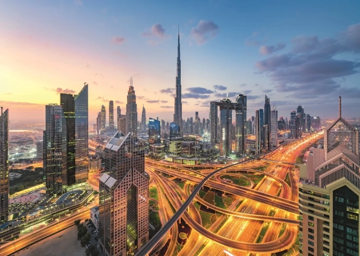 - Motiv Dubaja s podrobnim razgledom na ikonično panoramo.