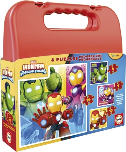 Zabaven komplet štirih progresivnih sestavljank z motivom IRON MAN bo razveselil male ljubitelje superjunakov. Vsaka sestavljanka ima različno število koščkov (6, 9, 12 in 16), zato lahko otroci postopoma dvigujejo zahtevnost in razvijajo logično mišljenje, potrpežljivost in fino motoriko. Praktičen plastičen kovček olajša prenašanje in shranjevanje.