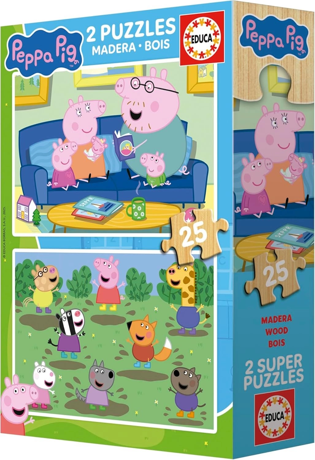 Odkrijte kakovostne lesene sestavljanke z motivom Pujsa Pepa v dveh slikah po 25 kosov. Sestavljanke so izdelane iz trpežnega naravnega lesa, imajo velike koščke za enostavno prijemanje in žive barve, ki takoj pritegnejo otroke. Idealne prve sestavljanke za majhne ročice in odlična izbira za razvoj fine motorike ter koncentracije.