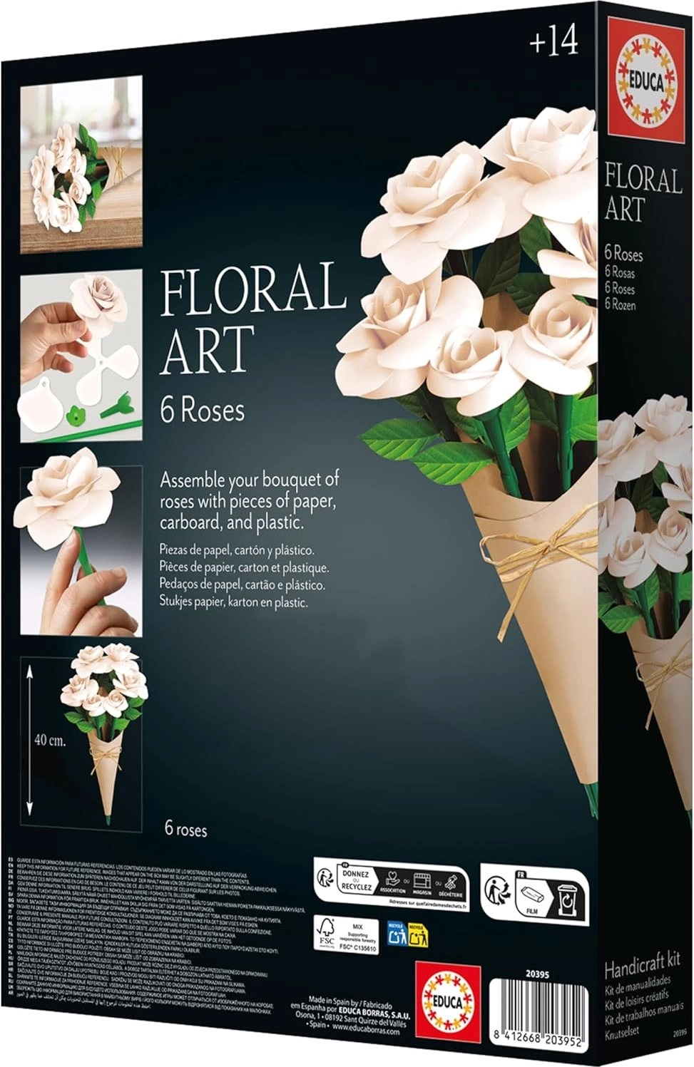 Uživajte v sproščujočem ustvarjanju z impresivnim kompletom EDUCA, ki združuje kreativnost, dizajn in preprostost. Sestavite nežen šopek belih vrtnic, ki bo krasil vaš interier, pisarno ali razveselil kot edinstveno darilo. Zahvaljujoč predizrezanim delom in premišljeni konstrukciji je sestavljanje enostavno in čisto – brez lepila in škarij.