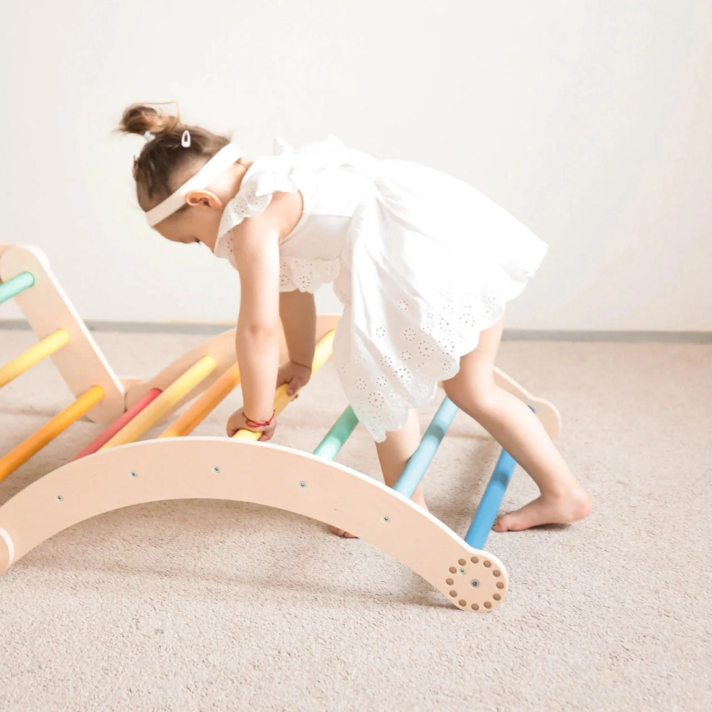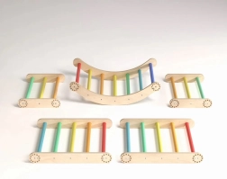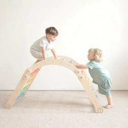 Sestava je sestavljena iz dveh plezalnih trikotnikov (večjega in manjšega) ter balansnega loka, ki jih je mogoče enostavno povezati v različne oblike – most, tunel, lestev ali hiško. Naravna struktura brezove vezane plošče v kombinaciji z nežnimi mavričnimi odtenki daje igračI sodoben videz in motivira otroke k aktivnemu gibanju.