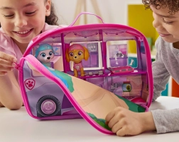 Zložljiv karavan dolžine približno 30 cm se po odprtju spremeni v bogato ilustrirano mini hiško s parkovno podlogo za piknik in počitek po misiji. Otroci bodo uživali v zgodbah, navdihnjenih s serijo, zahvaljujoč figuram Skye, Liberty in Everest z majajočimi glavicami in gibljivimi okončinami.