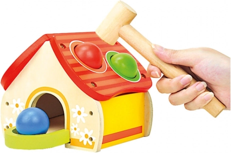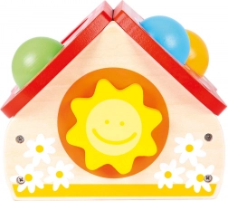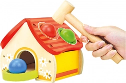 Ta kakovostna lesena igrača v podobi vesele hišice pritegne otroke z živahnimi barvami in preprostim principom igre – žogice se vstavljajo v odprtine na strehi in se z lahkimi udarci s kladivcem nežno zabijajo. Zabava spodbuja razvoj motorike, potrpežljivost in natančnost.